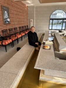 社長が朝のウォーキングの途中に、ご友人と足湯に浸かりながらモーニングを食べられたそうです。